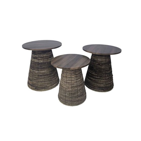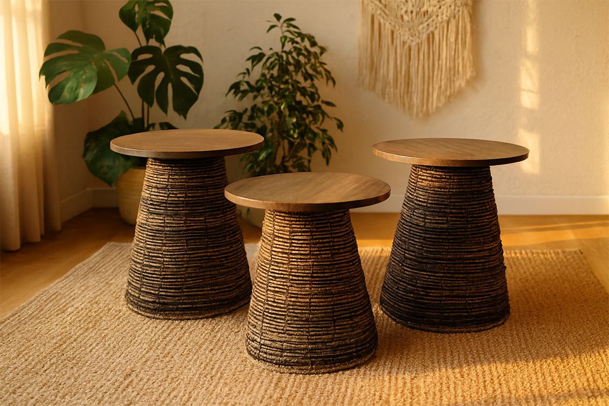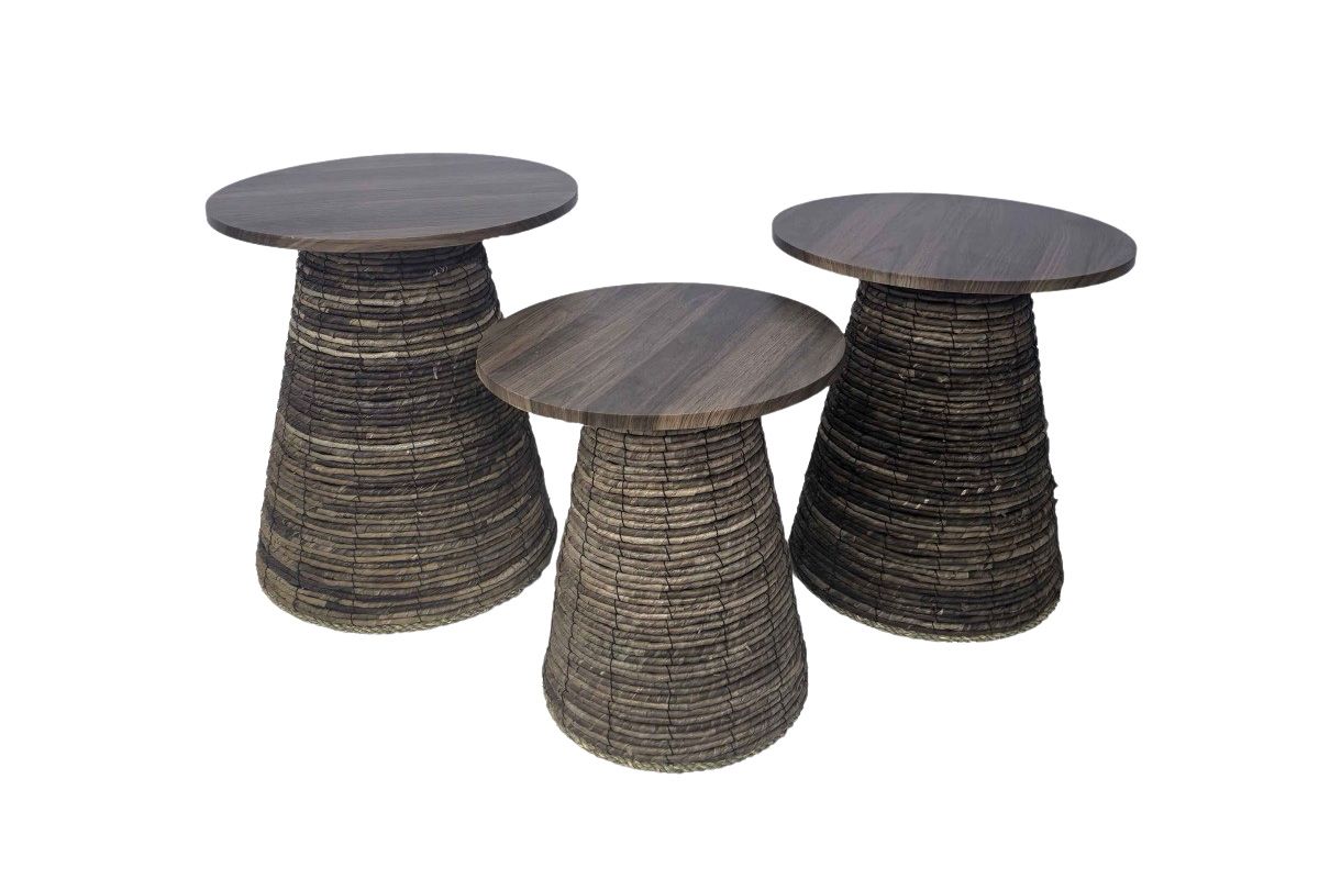 Ce trio de sellettes coniques en fibres naturelles joue sur trois nuances de beige pour une harmonie subtile et chaleureuse. Leurs formes élancées et leur dégradé ton sur ton en font un ensemble décoratif à exposer ensemble ou séparément. Idéales pour mettre en valeur plantes, objets ou bougies dans un salon ou un couloir. GM 50*47*47 / MM 45*45*45 / PM 40*40*40
