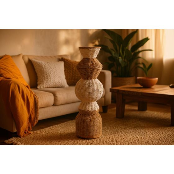 This tall vase in natural fibers stands out with its geometric shape and sleek silhouette. It adds structure to a room while bringing a natural, contemporary vibe. Display it on its own as a statement piece or add a few dried stems for an elegant, minimalist look.
