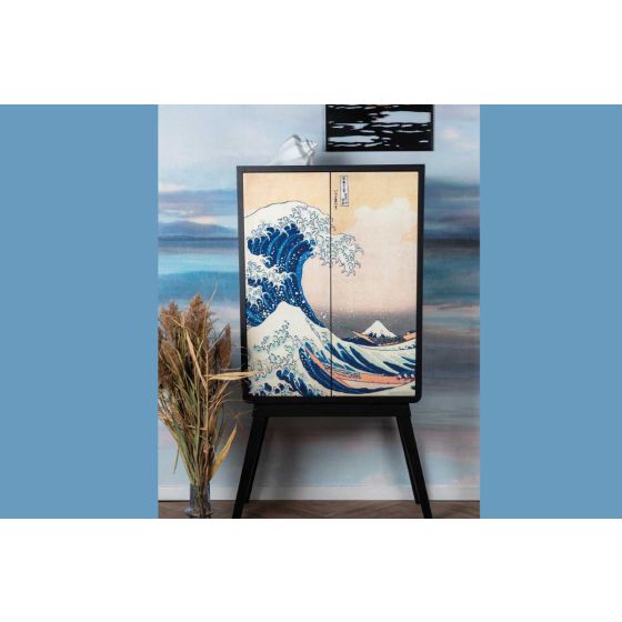 This tall two-door cabinet, adorned with Hokusai's famous wave, will bring an artistic and timeless touch to any room. Its MDF and pine structure ensures robustness and durability, while the doors equipped with a push and pull system offer great ease of use. A designer piece of furniture that combines aesthetics and functionality, perfect for complementing any interior. It will charm your clients looking for a product that is both elegant and modern.