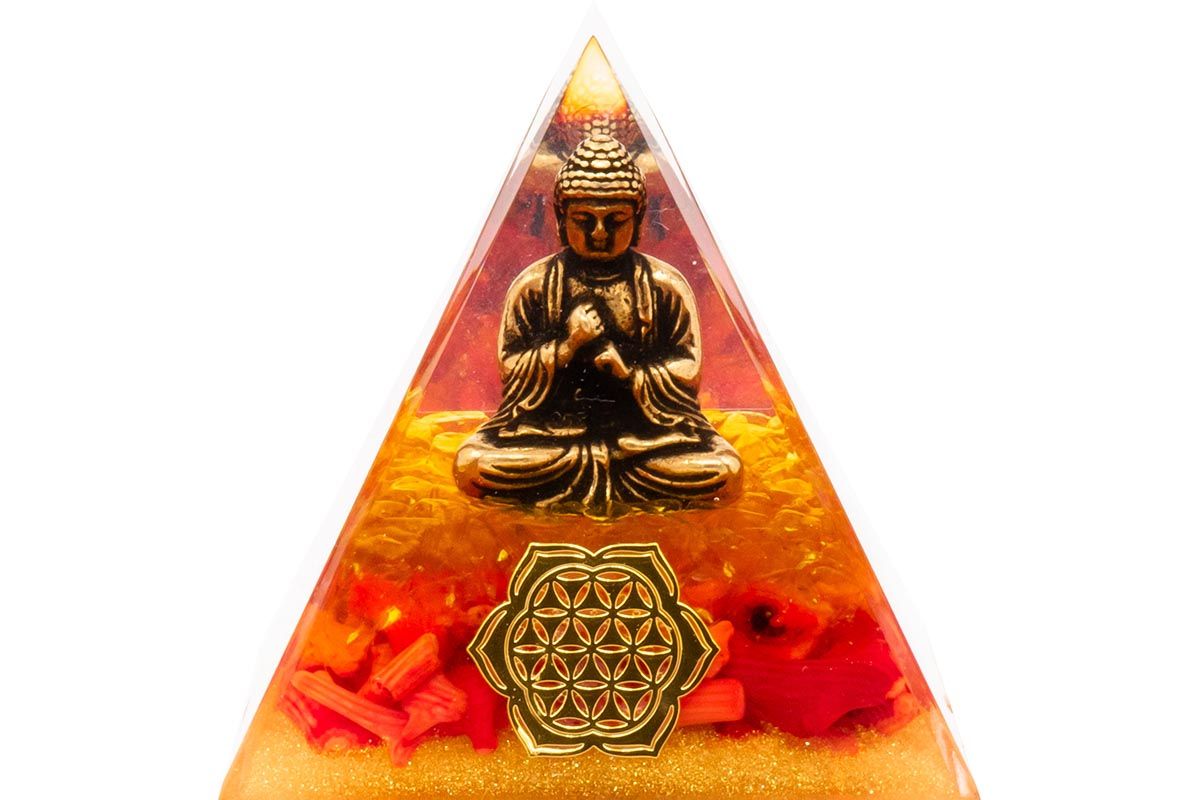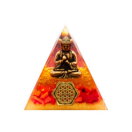 Pyramide Orgonite de protection en résine et pierre naturelle - quartz jaune - corail - bouddha, fle