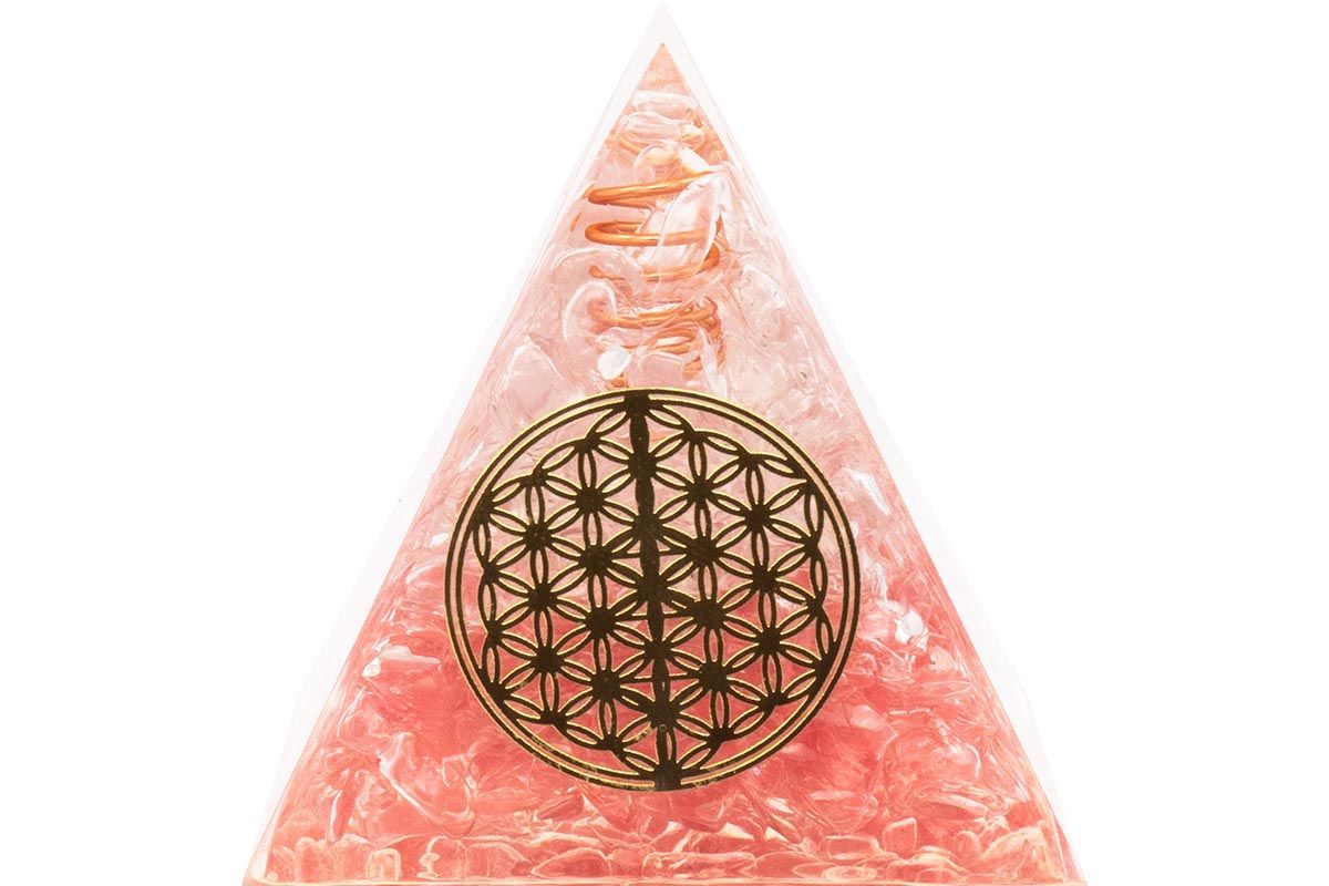 Pyramide Orgonite de protection en résine et pierre naturelle - quartz rose - fleur de vie en cuivre
