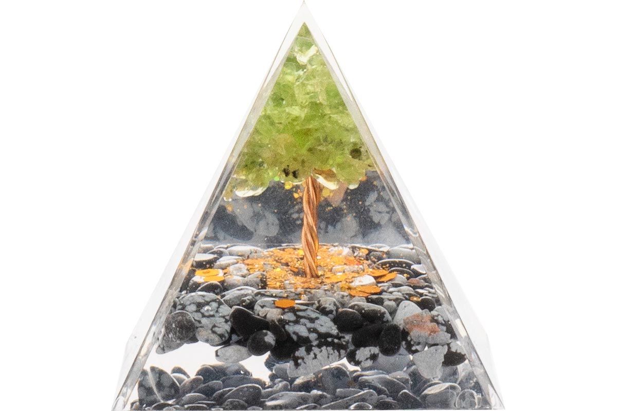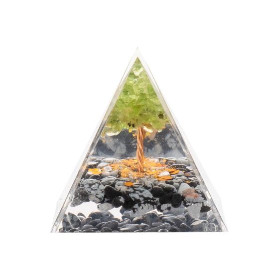 Pyramide Orgonite de protection en résine et pierre naturelle - quartz vert - obsidienne neige - 5x5