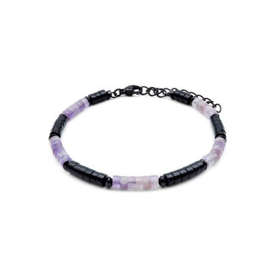 BISTEB303 - Bracelet acier PVD noir heishi - améthyste - onyx - 18+5cm -