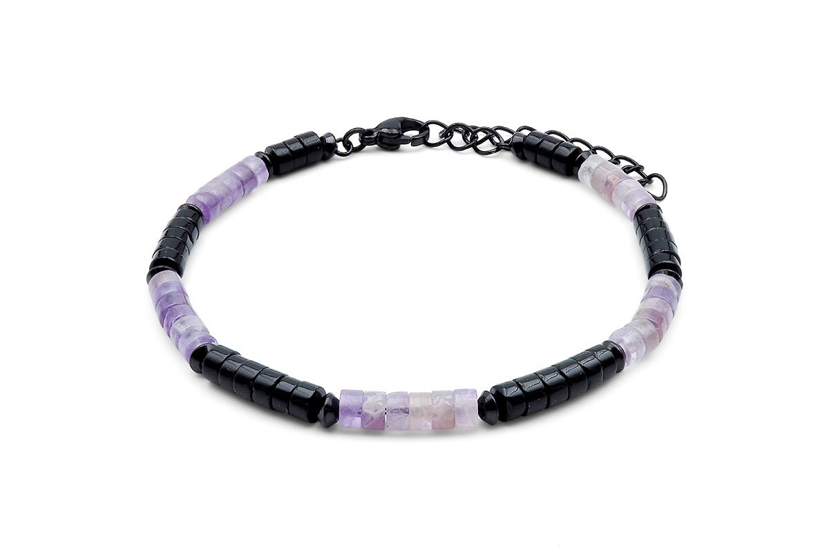 Bracelet acier PVD noir heishi - améthyste - onyx - 18+5cm