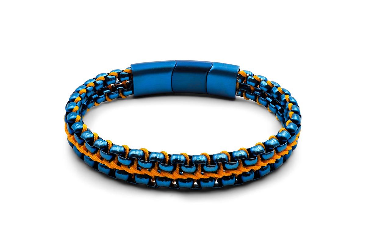 Bracelet acier PVD bleu - corde orange - 21,5+1,5cm