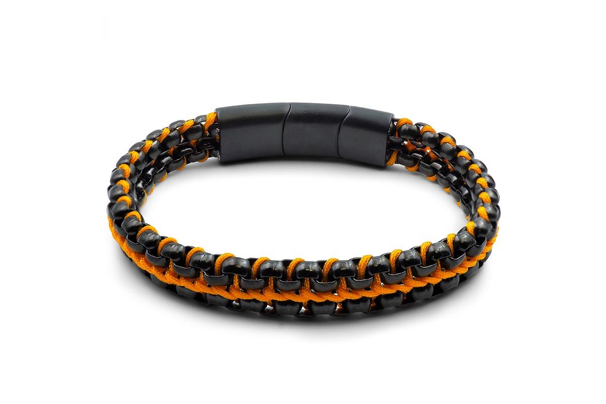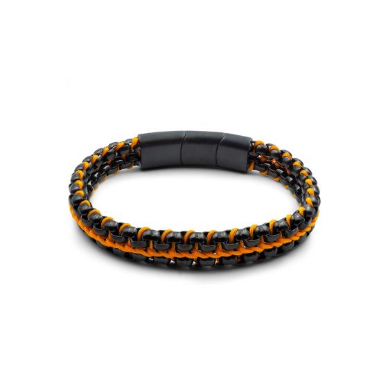 Bracelet acier PVD noir - corde orange - 21,5+1,5cm