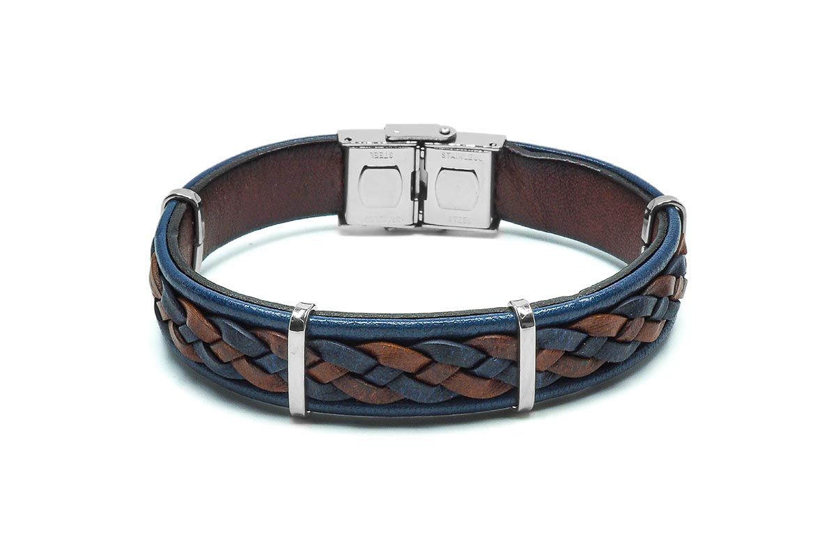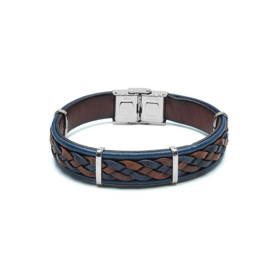 BIWSLB003 - Bracelet en acier - cuir italien tressé bleu et marron -