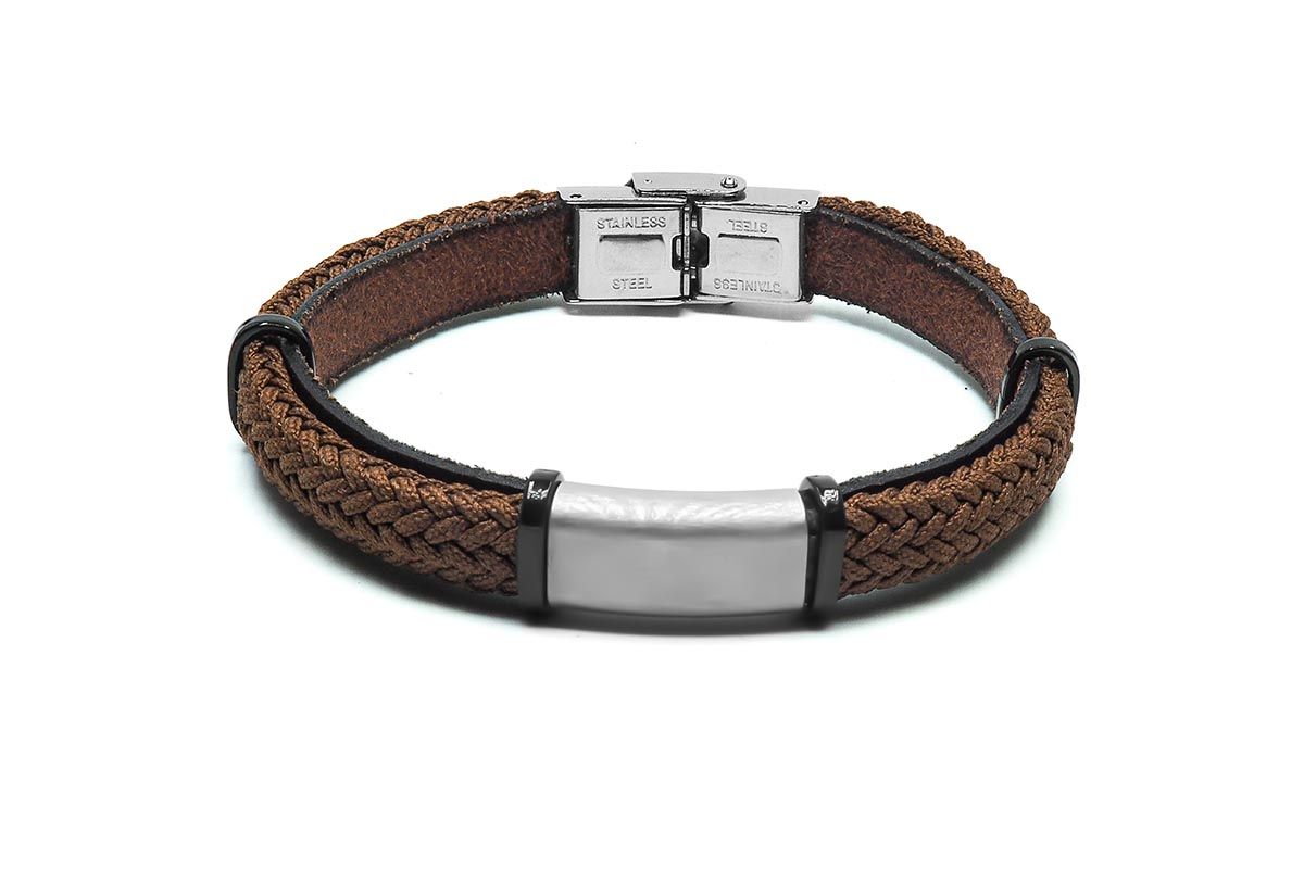 Bracelet en acier - cuir italien marron et cordon tressé marron