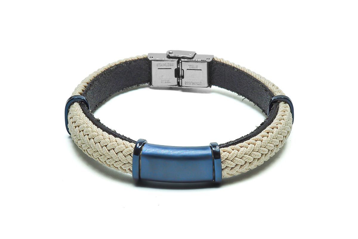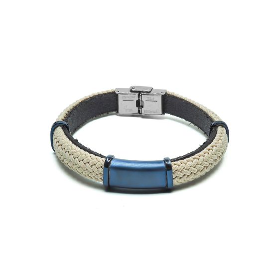 Bracelet en acier PVD bleu - cuir italien noir et cordon tressé beige