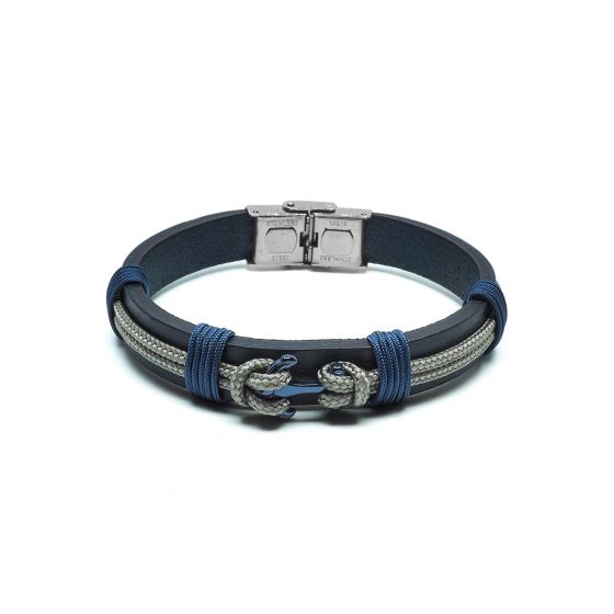 BIWSLB010 - Bracelet en acier PVD bleu - cuir italien - bleu foncé - ancre - cordon beige -