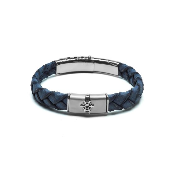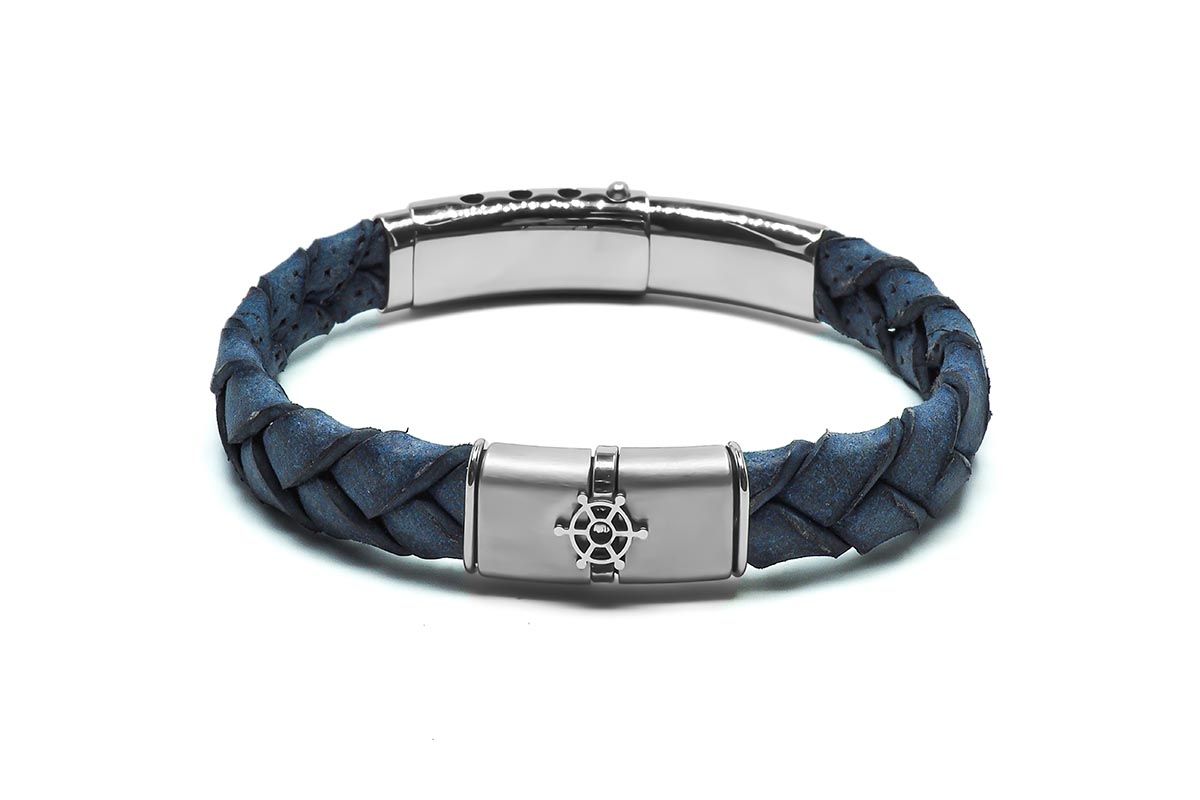 Bracelet en acier - cuir italien tressé bleu foncé - roue
