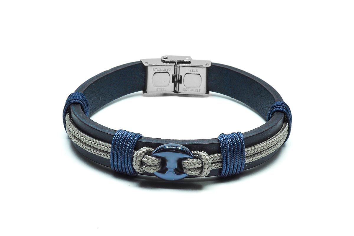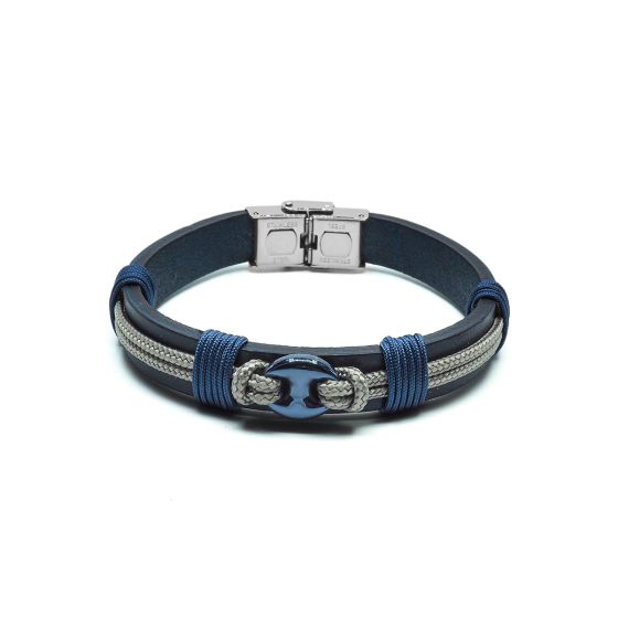 Bracelet en acier PVD bleu - cuir italien - bleu foncé - grain de café - cordon beige