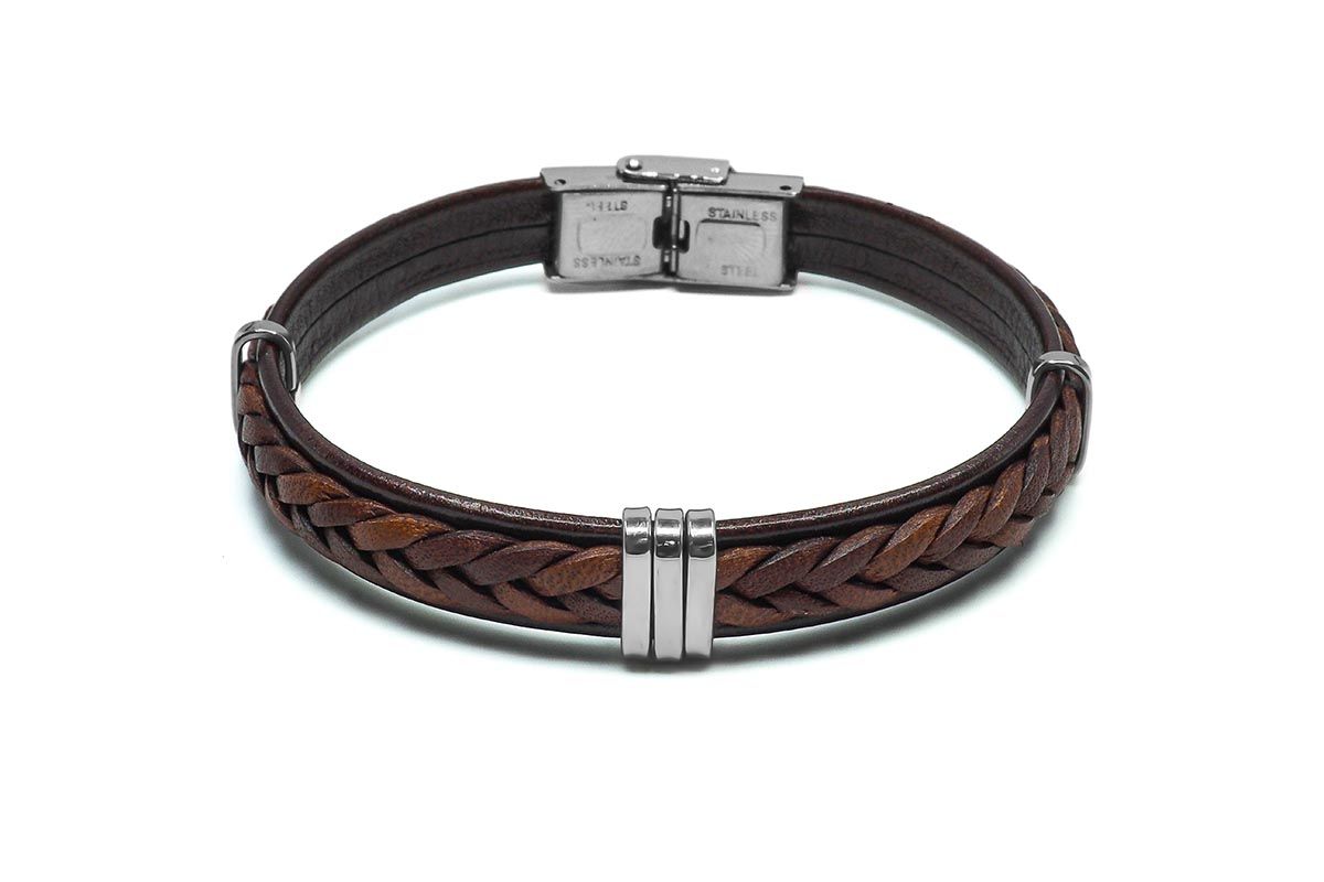 Bracelet en acier - cuir italien tressé marron