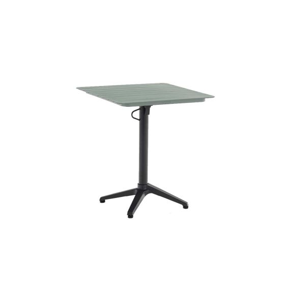 SPRING bistro table with tilting top, ideal for outdoor use all year round. It offers maximum corrosion resistance and a surface treatment resistant to stains and scratches, making it easy to clean. Designed for outdoor and communal spaces, it integrates perfectly with the seating from the SPRING, ALICANTE, and FLEOLE ranges by EZEÏS. This table for 2 to 4 people is perfect for small terraces and balconies. Its high-quality powder-coated aluminum structure requires no maintenance and withstands weather conditions. The tray made of matte-textured aluminum slats has smooth and rounded corners. It has adjustable pads for optimal stability, a rotating tray for easy storage, a weighted base for better stability, and an anti-theft ring for securing a chain or cable.