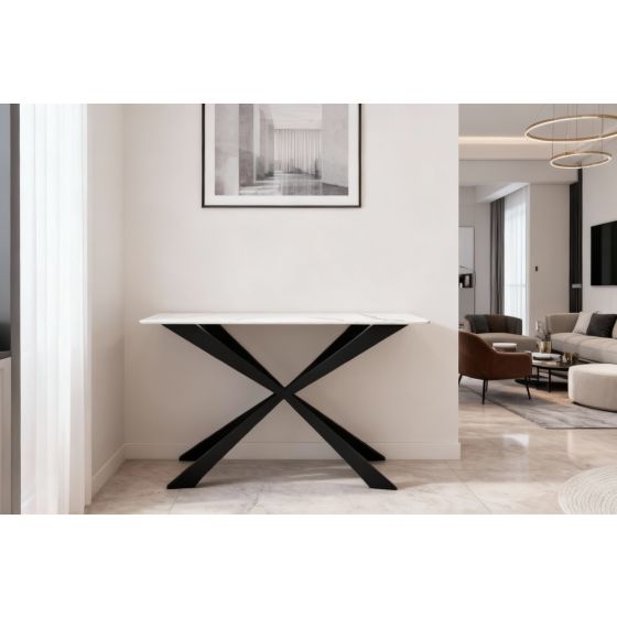 A touch of refinement for your interior with this console featuring a marble-effect ceramic top. The 1 cm thickness of the ceramic ensures a fine and robust finish. The black metal legs add a modern and elegant touch while ensuring excellent stability. Ideal for an entryway, a living room, or an office, this console combines aesthetics and functionality. A perfect choice for those looking for a piece of furniture that is both chic and practical.