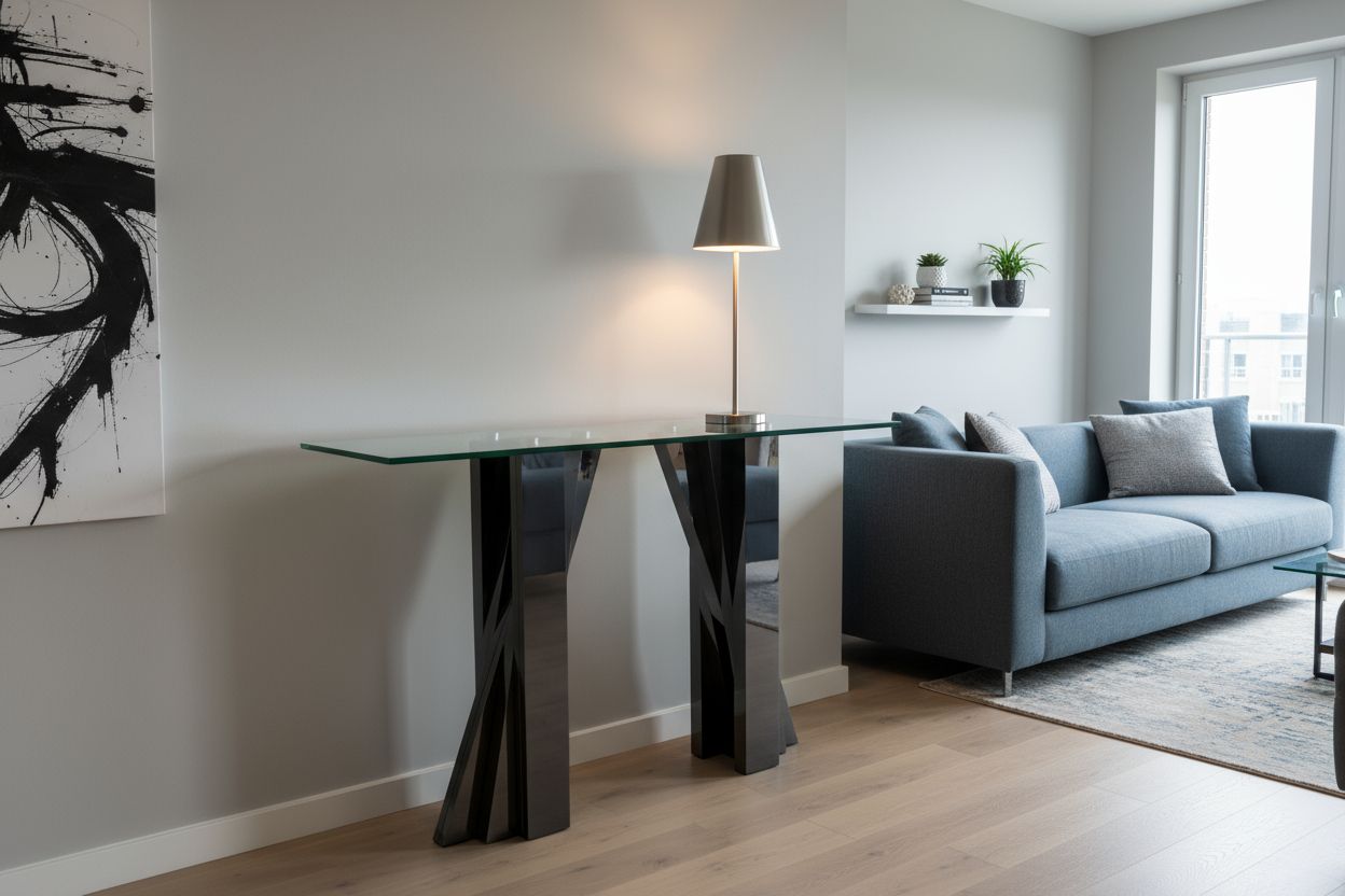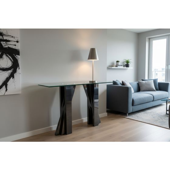 Cette console au plateau en verre transparent ajoutera une touche de modernité et d’élégance à votre intérieur. Son verre de 1 cm d'épaisseur assure solidité et finesse. Les pieds en métal, avec finition nickel effet fumé, apportent un design raffiné et contemporain. Parfaite pour le salon, l’entrée ou le bureau, elle combine style et praticité. Un choix idéal pour ceux qui recherchent un meuble chic et intemporel.