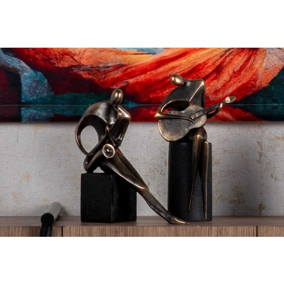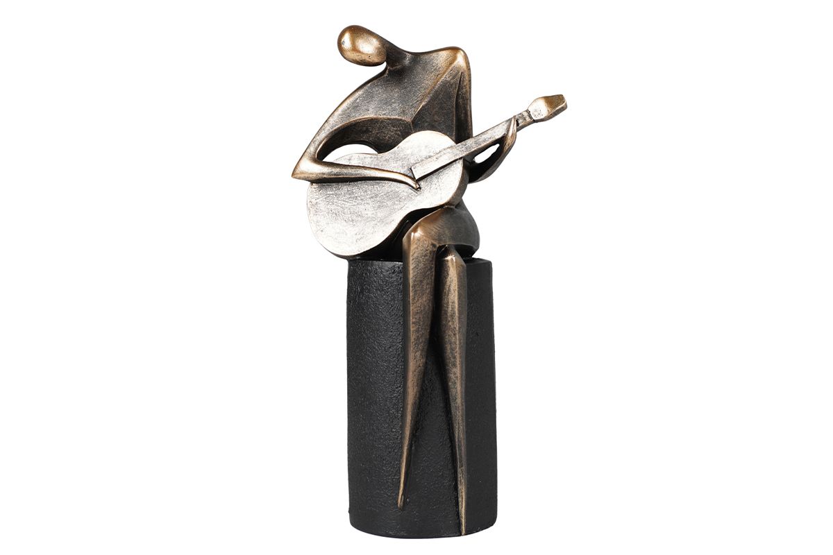 La collection INITIAL présente des sculptures en résine contemporaines aux allures artistiques. Ce musicien jouant de la guitare est en couleur bronze, très tendance, sur un socle effet roche. Placé dans un salon, faites ressortir votre fibre musicale.